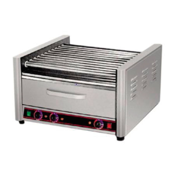 7 rodillos con teflón, doble termostato con focos indicadores, capacidad de 18 salchichas, motor eléctrico para giro de rodillos.